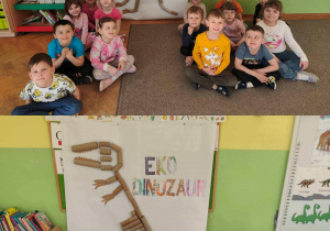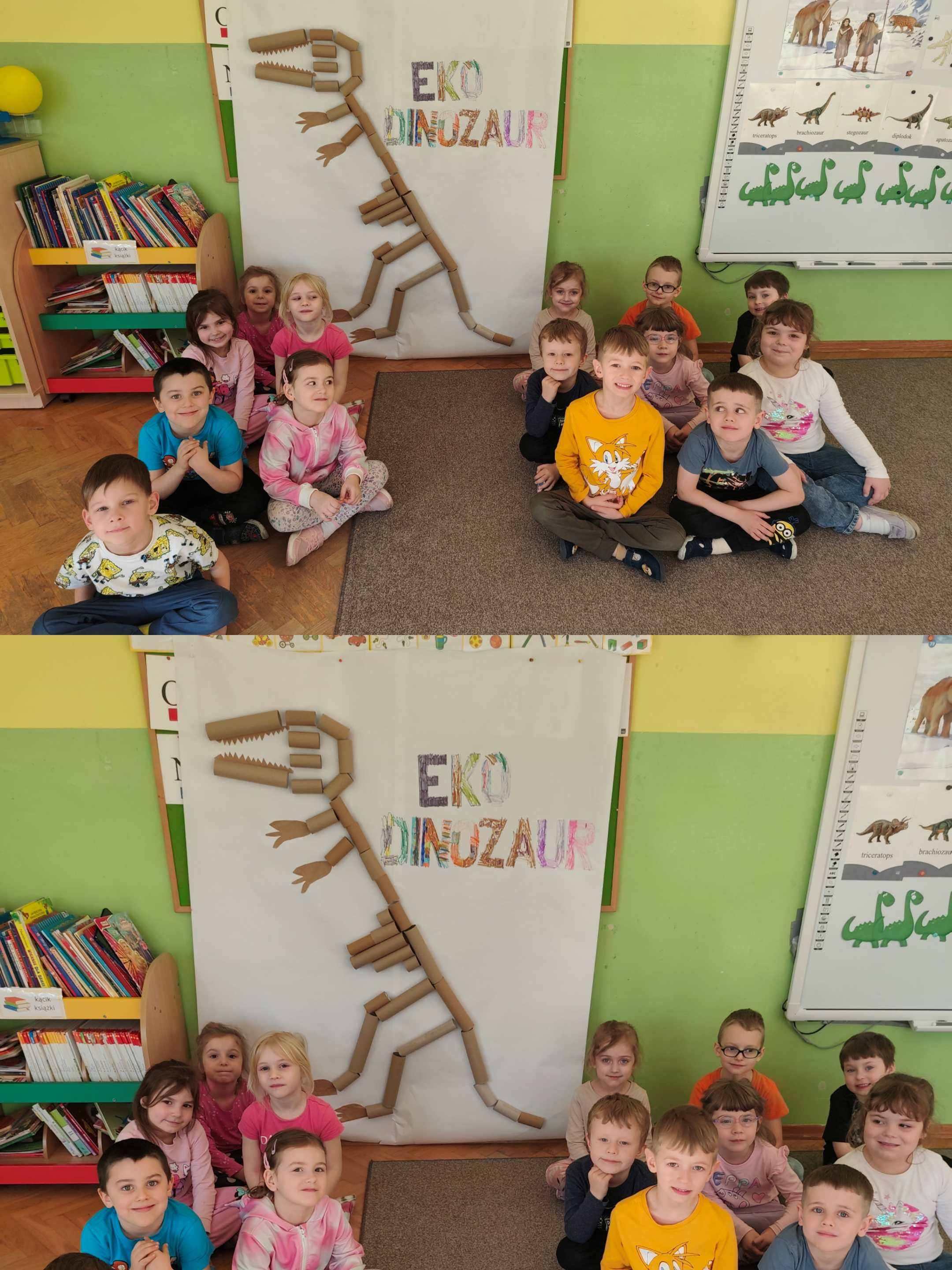 Nasza grupa uwielbia dinozaury. W tym dniu dzieci przeniosły się w prehistoryczny świat, poznając różne gatunki dinozaurów oraz ich trybu życia. Na zakończenie postanowiliśmy stworzyć eko szkielet dinozaura.Oto efekt naszej wspólnej pracy.
