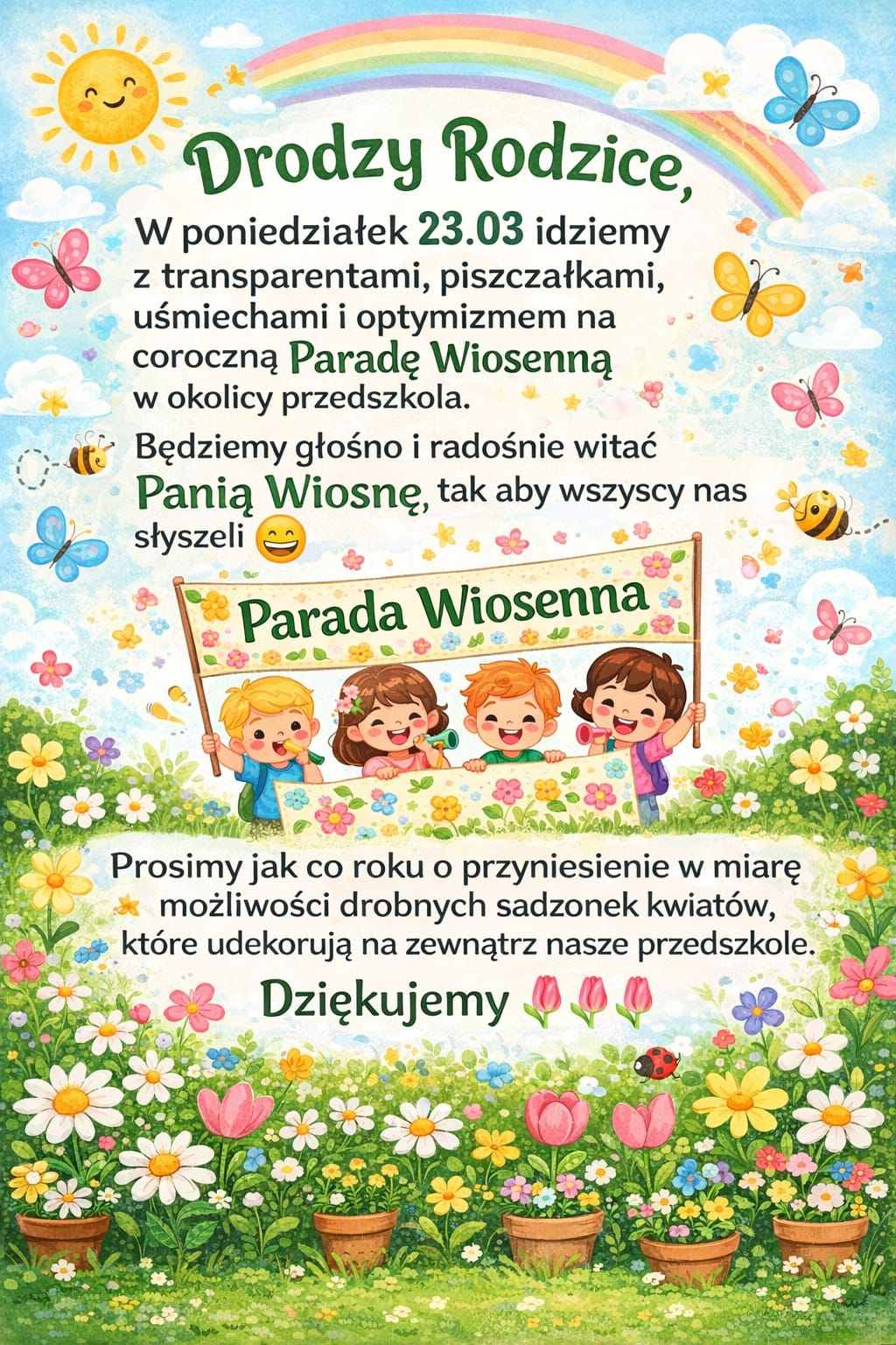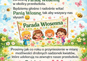 W poniedziałek 23.03 dzieci z całego przedszkola idą wraz z transparentami oraz uśmiechem na coroczną Paradę Wiosenną aby głośno i radośnie powitać Panią Wiosnę.