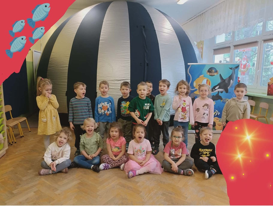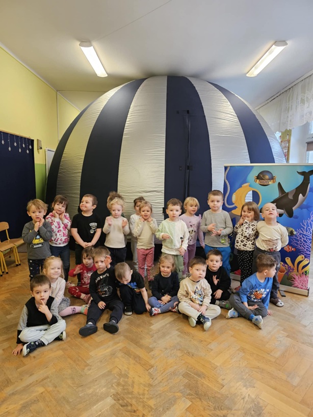 Nasze przedszkole po raz kolejny odwiedziło mobilne planetarium. Pokaz mobilnego planetarium wzbudził wśród dzieci ogromne zainteresowanie i wiele radości. Już samo wejście do dużej, tajemniczej kopuły wywołało u przedszkolaków zachwyt i ciekawość. Dzieci z ogromnym skupieniem oglądały pokaz o rafie koralowej. Pokaz był dostosowany do wieku uczestników, dzięki czemu nawet najmłodsze dzieci z łatwością zrozumiały prezentowane treści.